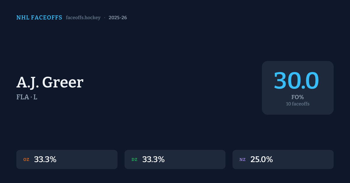 A.J. Greer has a 2022-23 faceoff win percentage of 66.7% across 3 faceoffs in the 2022-23 season. Best zone: Offensive (100.0%).