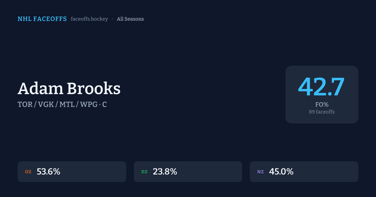 Adam Brooks has a career faceoff win percentage of 42.7% across 89 faceoffs. Best zone: Offensive (53.6%).