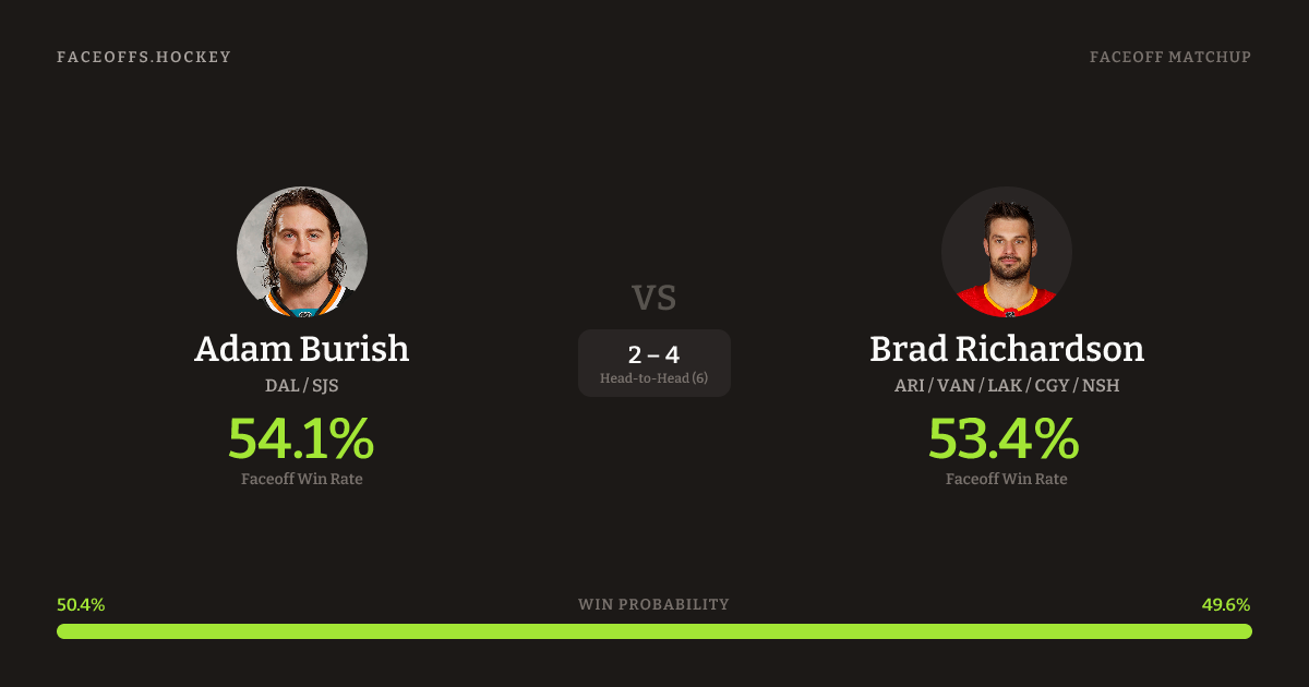 Adam Burish holds a +5.3% FO% edge overall. Look for Richardson on defensive-zone draws (67% H2H, 3 meetings). Burish wins 54.1% vs left-shot opponents — Richardson shoots left.