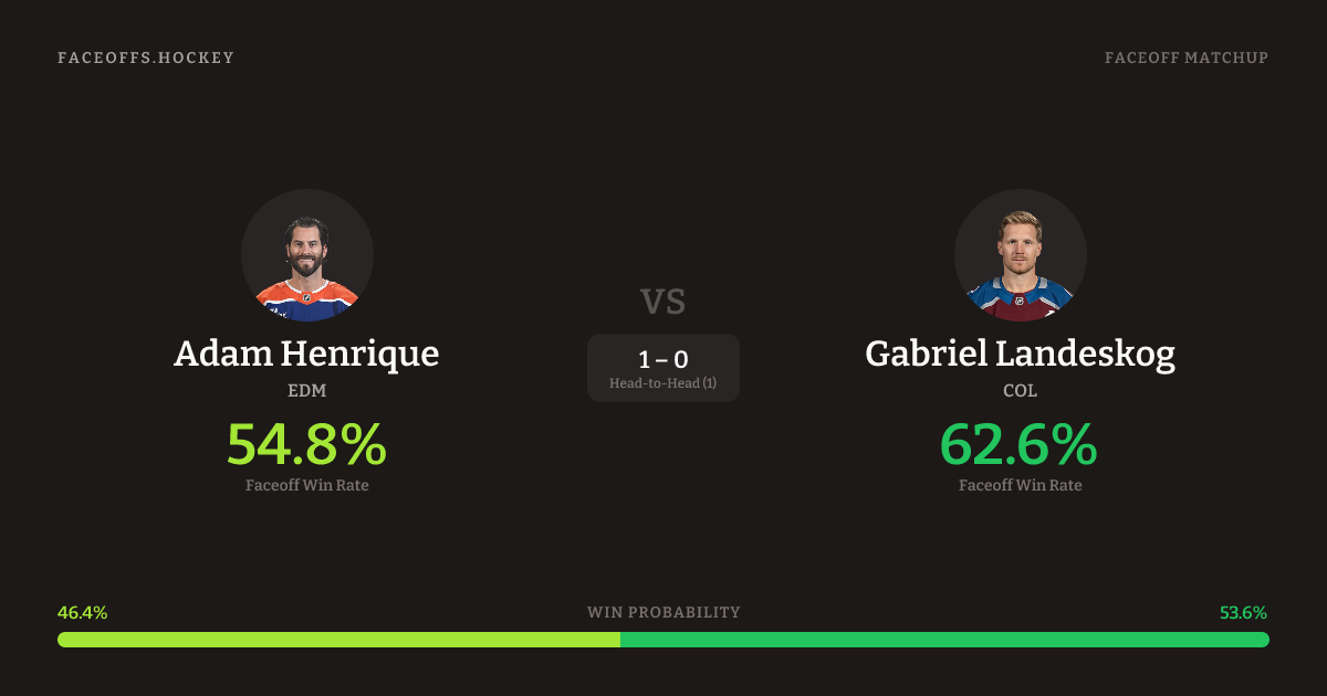 Gabriel Landeskog holds a +1.2% FO% edge overall. Look for Landeskog on offensive-zone draws (86% H2H, 7 meetings). Henrique wins 55.2% vs left-shot opponents — Landeskog shoots left.