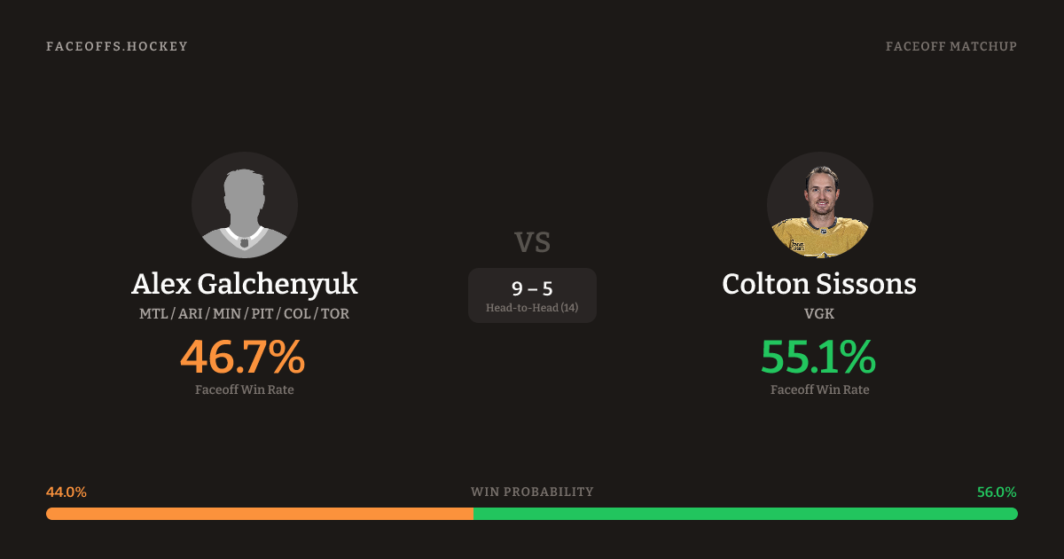 Colton Sissons holds a +3.4% FO% edge overall. Look for Galchenyuk on offensive-zone draws (100% H2H, 3 meetings). Galchenyuk wins 53.2% vs right-shot opponents — Sissons shoots right.