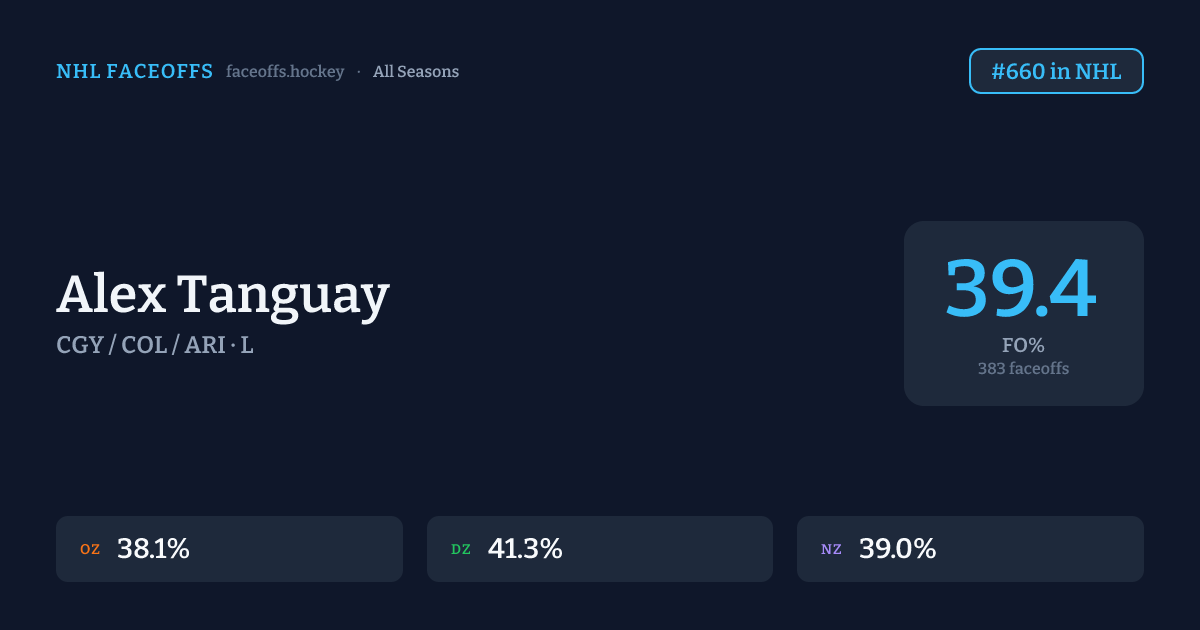 Alex Tanguay has a career faceoff win percentage of 39.4% across 383 faceoffs. Best zone: Defensive (41.3%). Ranked #660 in the league.