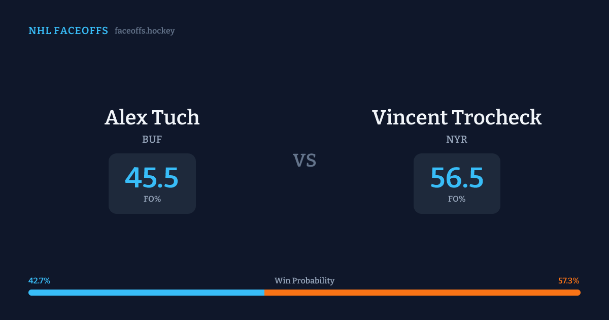 Vincent Trocheck holds a +18.3% FO% edge overall. Look for Trocheck on neutral-zone draws (67% H2H, 3 meetings). Tuch wins 43.3% vs right-shot opponents — Trocheck shoots right.