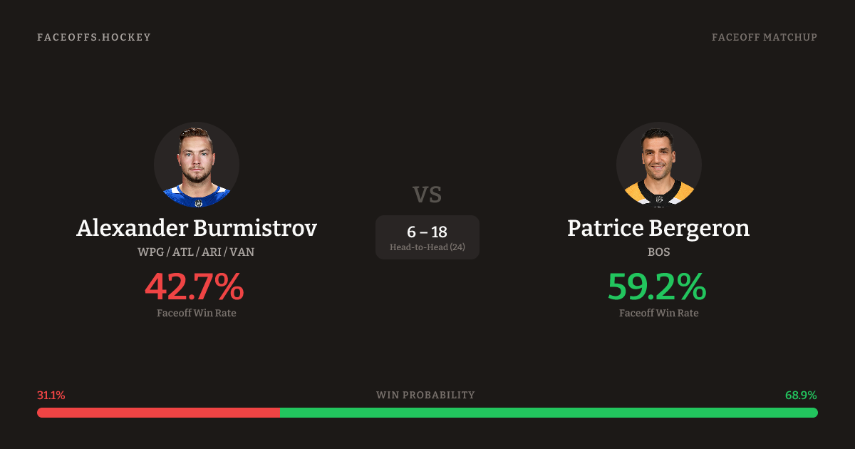 Patrice Bergeron holds a +16.5% FO% edge overall. Look for Bergeron on defensive-zone draws (100% H2H, 8 meetings). Burmistrov wins 40.3% vs right-shot opponents — Bergeron shoots right.