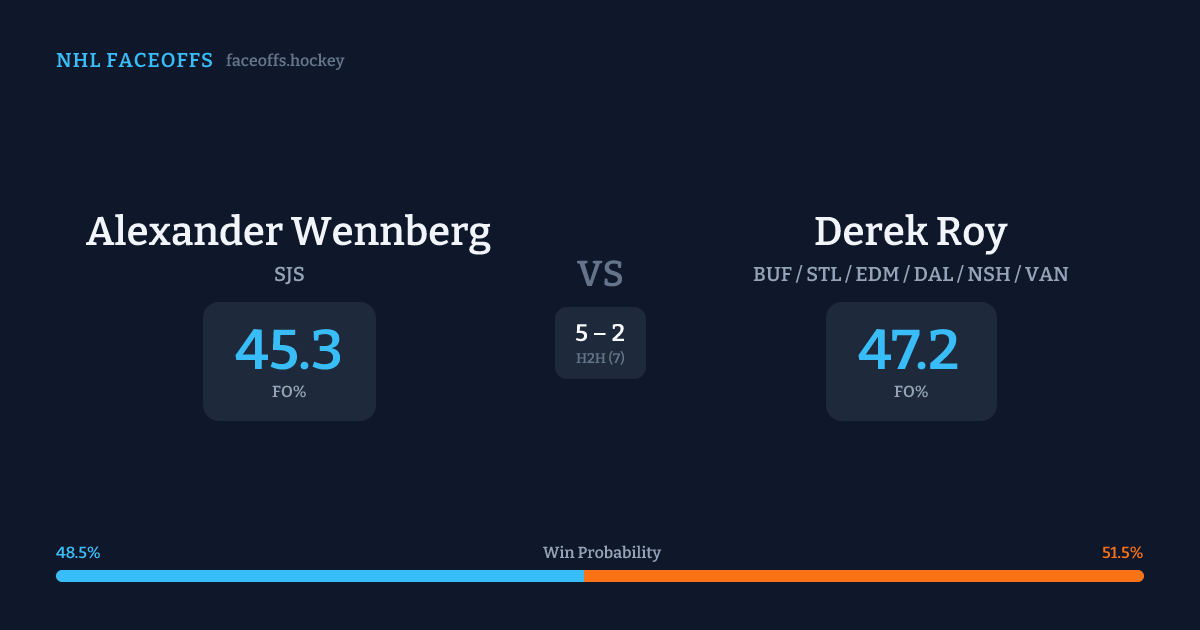 Derek Roy holds a +2.1% FO% edge overall. Look for Wennberg on offensive-zone draws (67% H2H, 3 meetings).