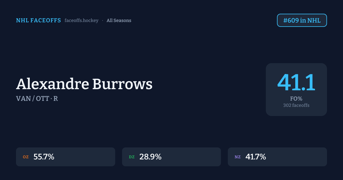 Alexandre Burrows has a career faceoff win percentage of 41.1% across 302 faceoffs. Best zone: Offensive (55.7%). Ranked #609 in the league.