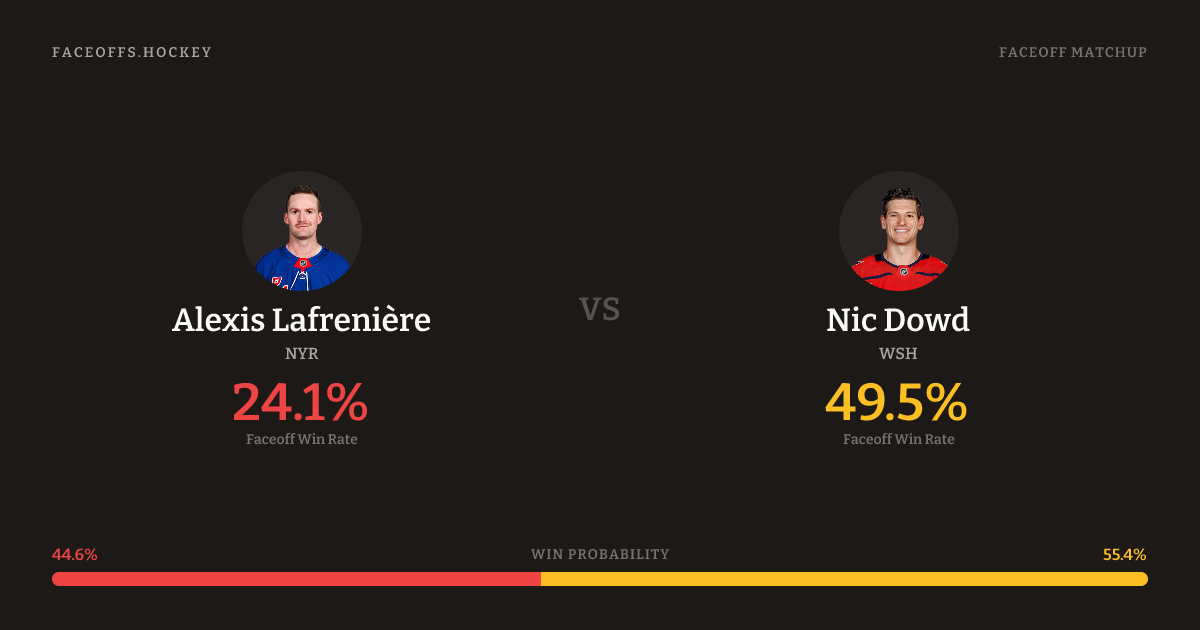 Nic Dowd holds a +22.3% FO% edge overall. Look for Dowd on defensive-zone draws (100% H2H, 3 meetings). Lafrenière wins 30.0% vs right-shot opponents — Dowd shoots right.