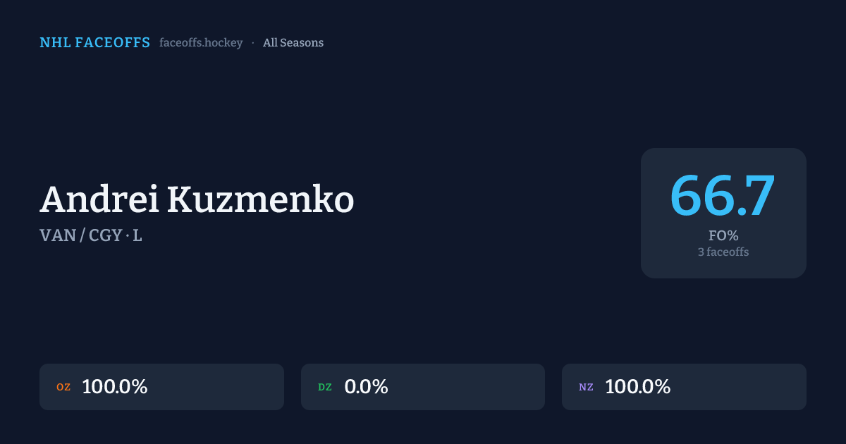 Andrei Kuzmenko has a career faceoff win percentage of 66.7% across 3 faceoffs. Best zone: Neutral (100.0%).