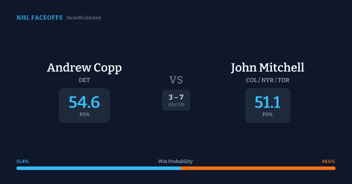John Mitchell holds a +2.8% FO% edge overall. Look for Mitchell on offensive-zone draws (80% H2H, 5 meetings). Copp wins 44.6% vs left-shot opponents — Mitchell shoots left.