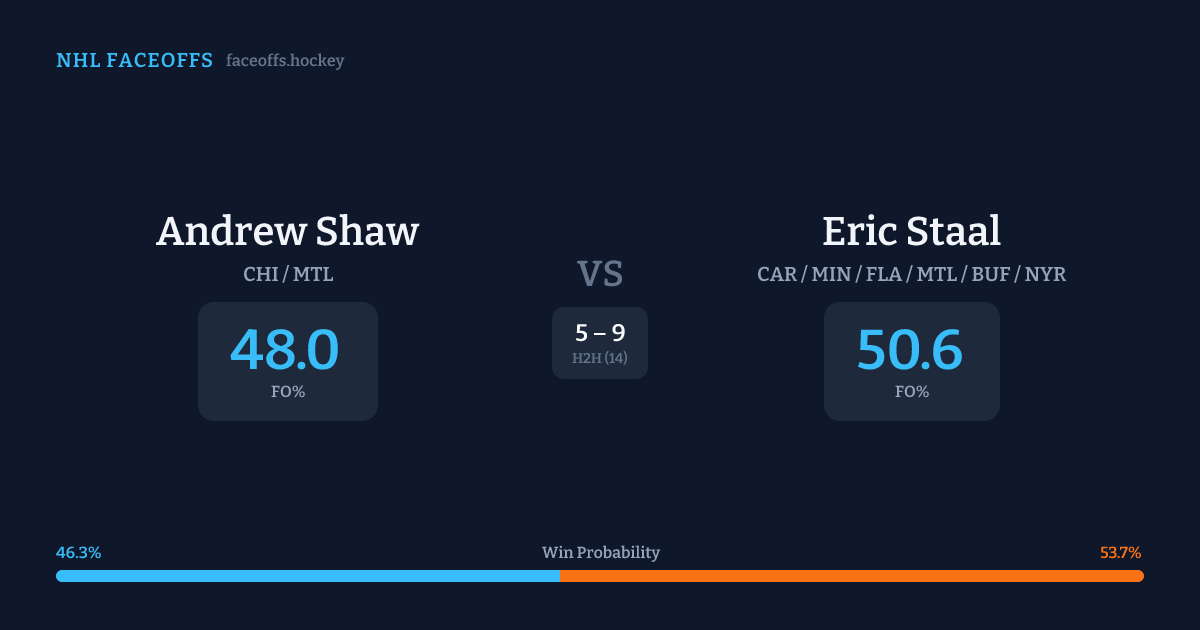 Andrew Shaw holds a +3.1% FO% edge overall. Shaw wins 53.4% vs left-shot opponents — Staal shoots left.