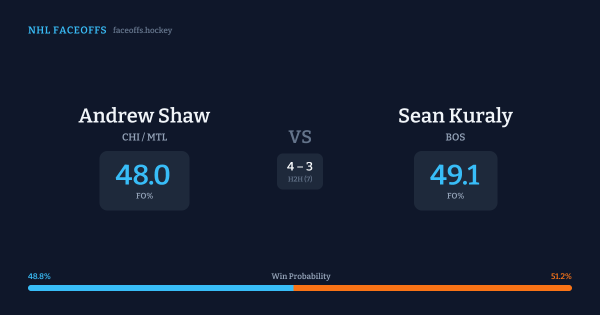 Andrew Shaw holds a +7.8% FO% edge overall. Look for Kuraly on defensive-zone draws (100% H2H, 3 meetings). Shaw wins 53.4% vs left-shot opponents — Kuraly shoots left.