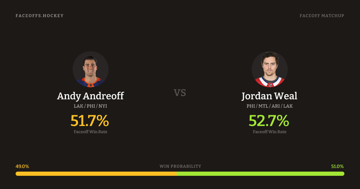 Weal shoots right. Andreoff is 48.4% vs right-shot opponents (192).