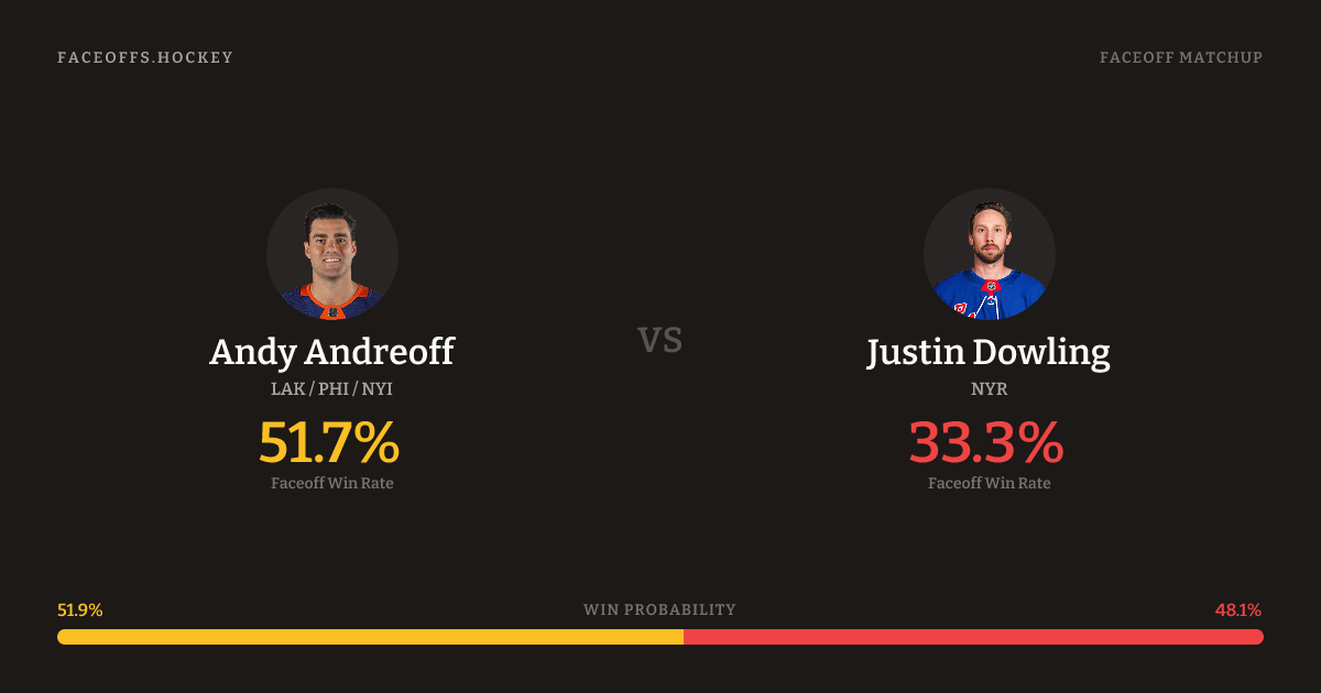 Andy Andreoff holds a +2.9% FO% edge overall. Andreoff wins 53.7% vs left-shot opponents — Dowling shoots left.