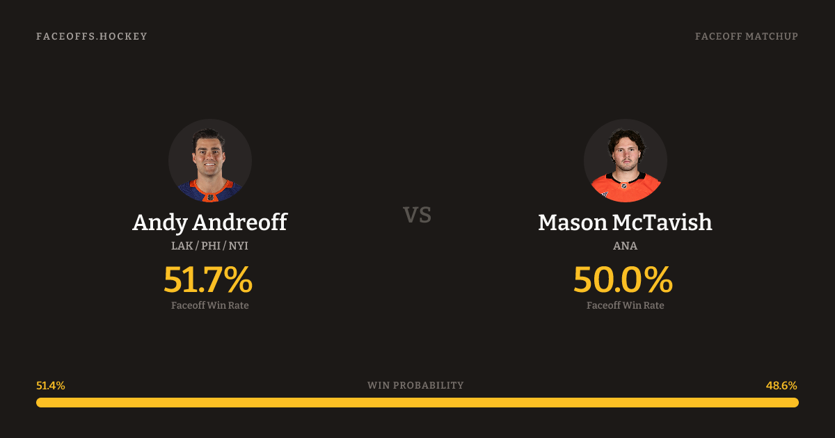Andy Andreoff holds a +2.8% FO% edge overall. Andreoff wins 53.7% vs left-shot opponents — McTavish shoots left.
