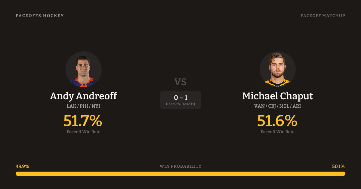 These two are closely matched in overall FO% (51.7% vs 51.6%). Andreoff wins 53.7% vs left-shot opponents — Chaput shoots left.