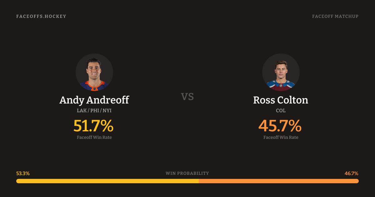 These two are closely matched in overall FO% (51.7% vs 51.1%). Andreoff wins 53.7% vs left-shot opponents — Colton shoots left.