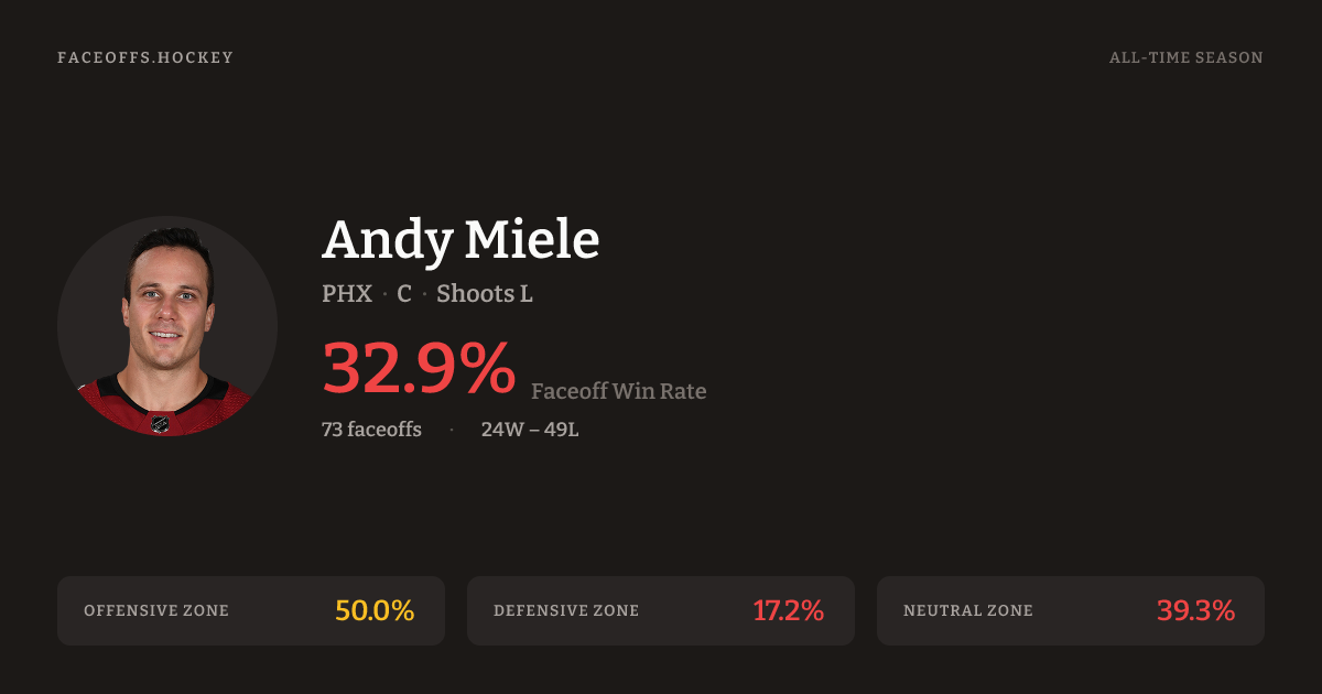 Andy Miele has a career faceoff win percentage of 32.9% across 73 faceoffs. Best zone: Offensive (50.0%).