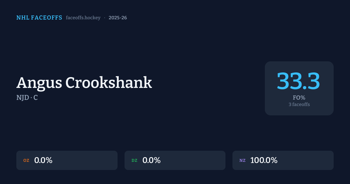 Angus Crookshank has a career faceoff win percentage of 33.3% across 6 faceoffs. Best zone: Neutral (50.0%).