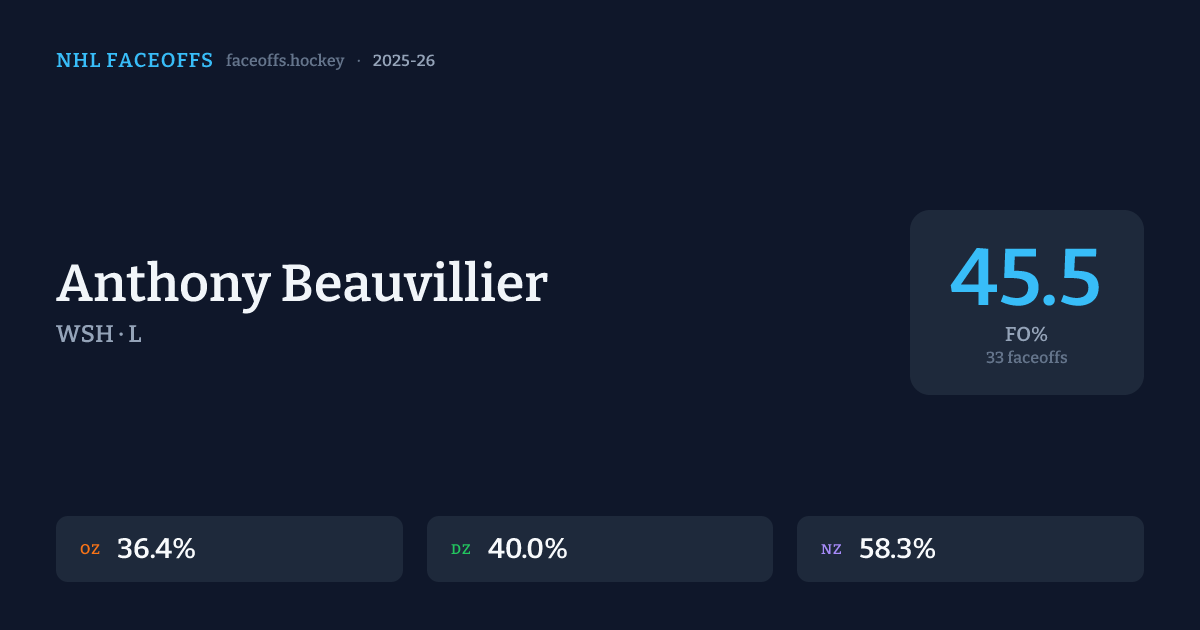 Anthony Beauvillier has a 2025-26 faceoff win percentage of 45.5% across 33 faceoffs in the 2025-26 season. Best zone: Neutral (58.3%).