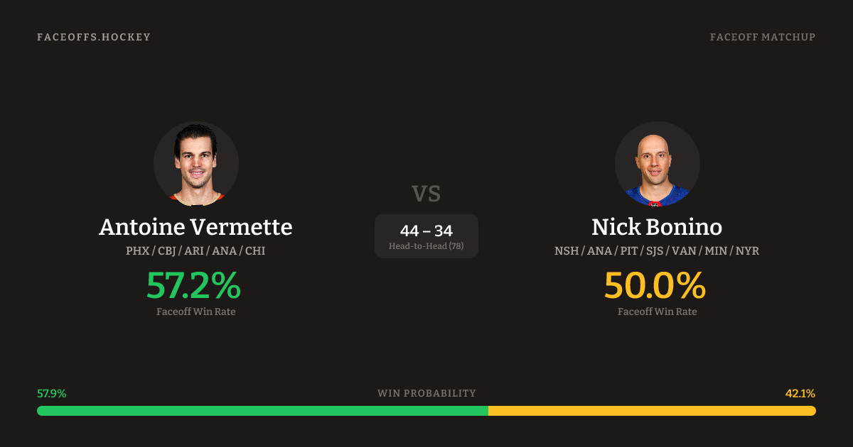 Antoine Vermette holds a +7.9% FO% edge overall. Look for Bonino on offensive-zone draws (80% H2H, 5 meetings). Vermette wins 54.7% vs left-shot opponents — Bonino shoots left.