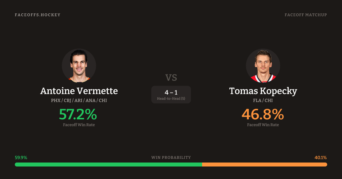 Antoine Vermette holds a +13.3% FO% edge overall. Look for Vermette on defensive-zone draws (100% H2H, 4 meetings). Vermette wins 53.2% vs left-shot opponents — Kopecky shoots left.