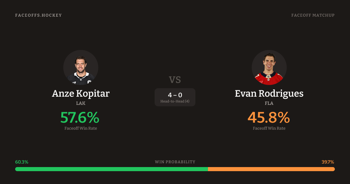 Anze Kopitar holds a +8.7% FO% edge overall. Look for Rodrigues on offensive-zone draws (75% H2H, 4 meetings). Kopitar wins 53.8% vs right-shot opponents — Rodrigues shoots right.