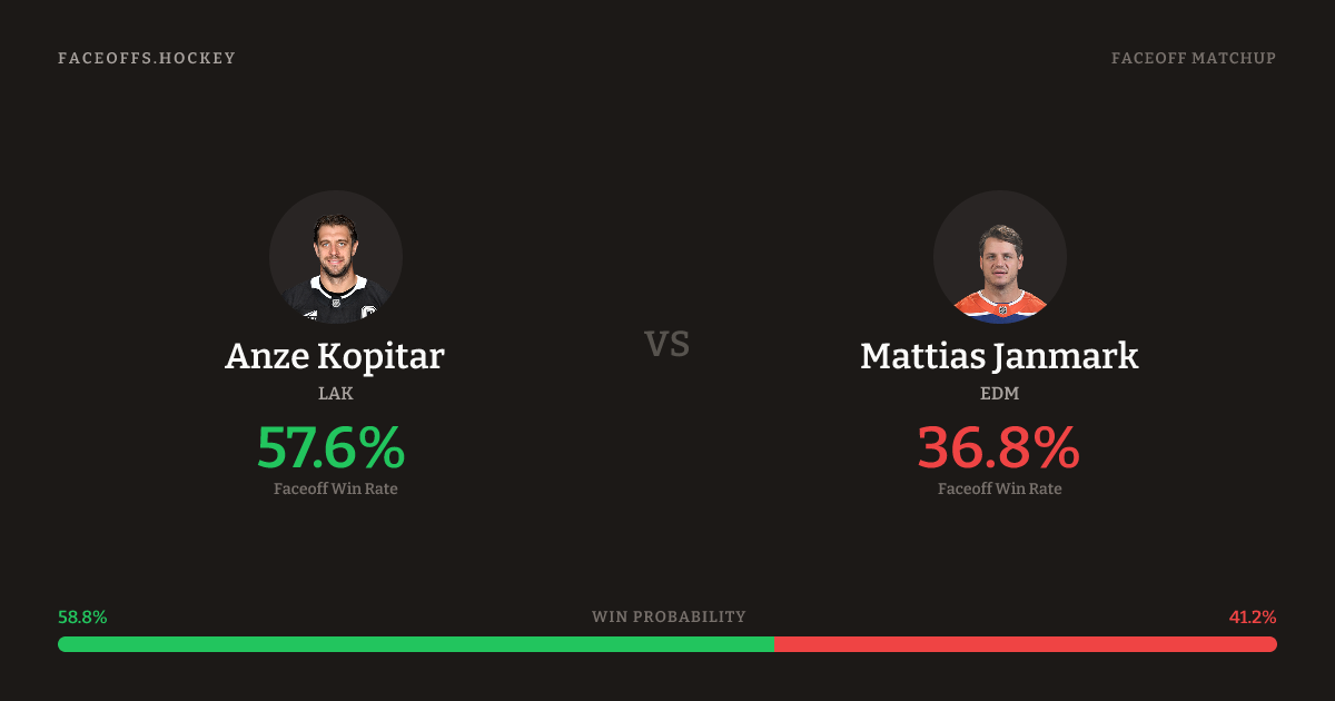 Anze Kopitar holds a +16.6% FO% edge overall. Look for Kopitar on defensive-zone draws (100% H2H, 3 meetings). Kopitar wins 58.5% vs left-shot opponents — Janmark shoots left.