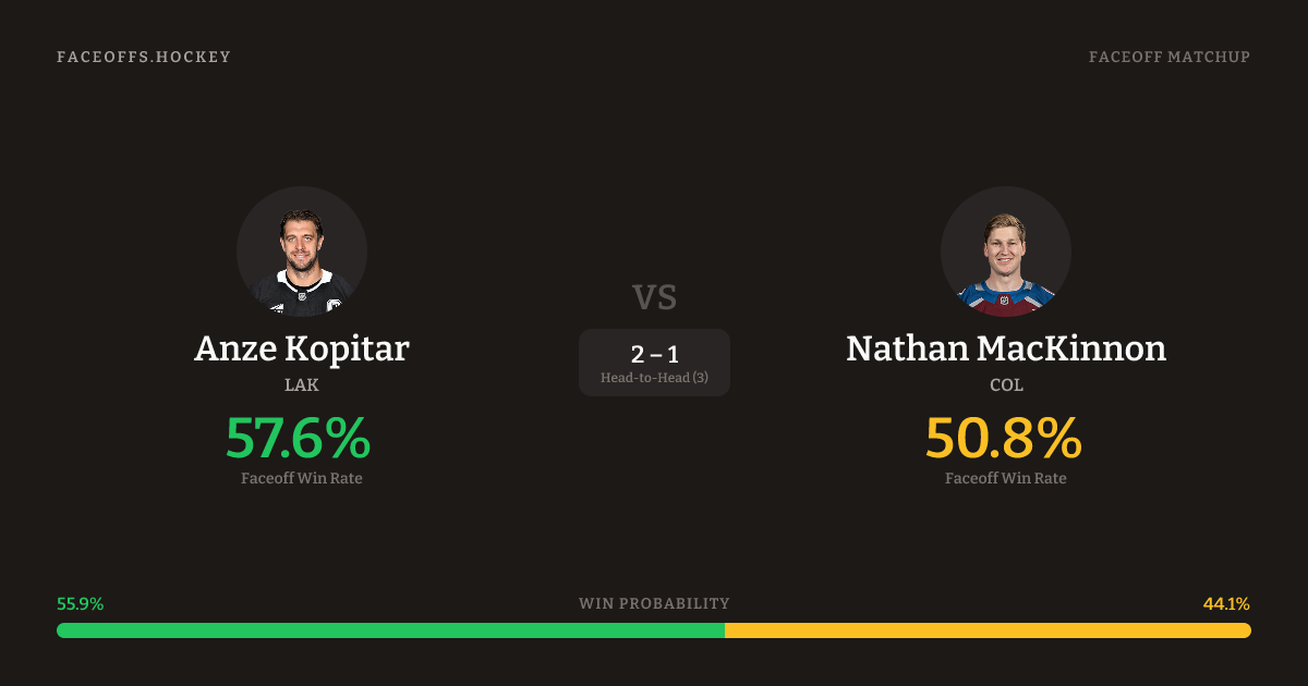Anze Kopitar holds a +8.8% FO% edge overall. Look for MacKinnon on neutral-zone draws (72% H2H, 18 meetings). Kopitar wins 63.2% vs right-shot opponents — MacKinnon shoots right.