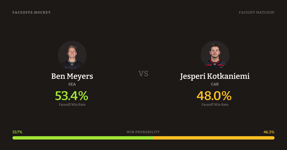 Jesperi Kotkaniemi holds a +5.4% FO% edge overall. Look for Kotkaniemi on neutral-zone draws (80% H2H, 5 meetings).