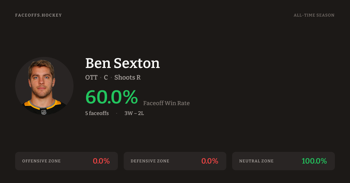 Ben Sexton has a career faceoff win percentage of 60.0% across 5 faceoffs. Best zone: Neutral (100.0%).
