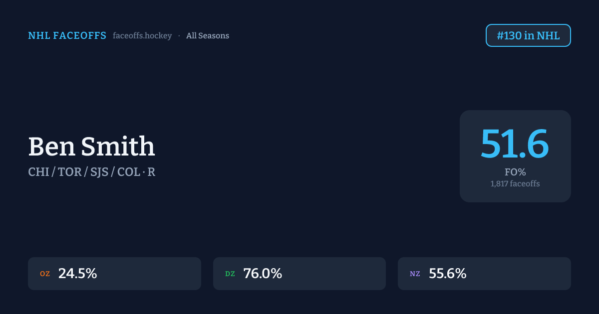 Ben Smith has a career faceoff win percentage of 51.6% across 1,817 faceoffs. Best zone: Defensive (76.0%). Ranked #130 in the league.