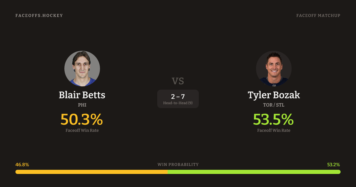 Tyler Bozak holds a +4.3% FO% edge overall. Look for Bozak on offensive-zone draws (100% H2H, 4 meetings).
