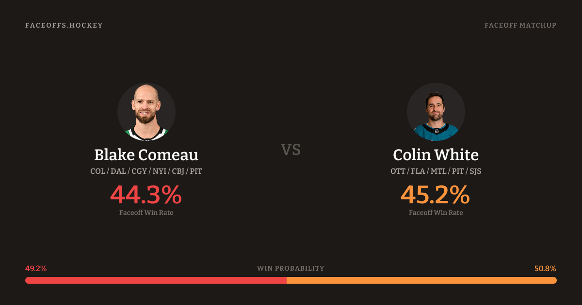 White shoots right. Comeau is 48.2% vs right-shot opponents (481).
