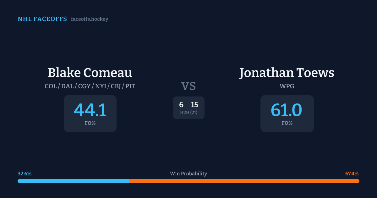 Jonathan Toews holds a +13.6% FO% edge overall. Look for Toews on offensive-zone draws (80% H2H, 5 meetings). Comeau wins 42.7% vs left-shot opponents — Toews shoots left.
