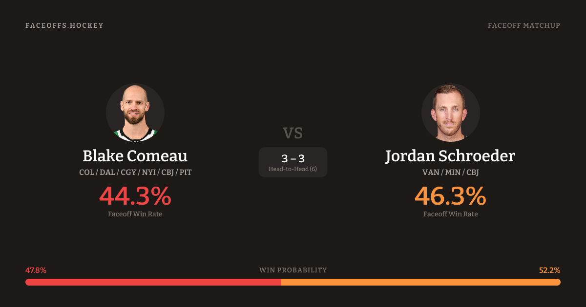 Blake Comeau holds a +2.9% FO% edge overall. Look for Comeau on neutral-zone draws (67% H2H, 3 meetings). Comeau wins 58.3% vs right-shot opponents — Schroeder shoots right.