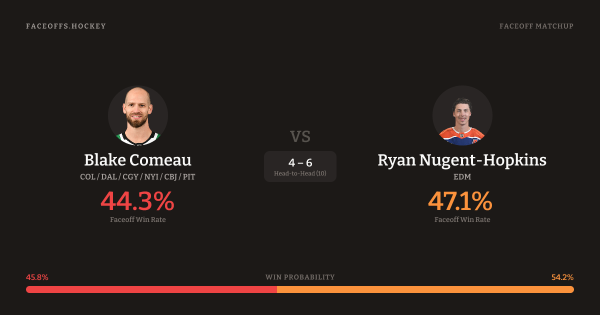 These two are closely matched in overall FO% (44.3% vs 44.7%). Look for Nugent-Hopkins on defensive-zone draws (75% H2H, 4 meetings). Comeau wins 42.7% vs left-shot opponents — Nugent-Hopkins shoots left.