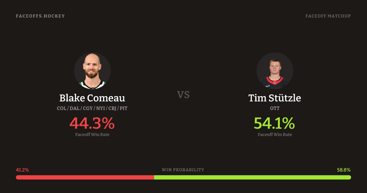 Tim Stützle holds a +1.1% FO% edge overall. Comeau wins 42.7% vs left-shot opponents — Stützle shoots left.