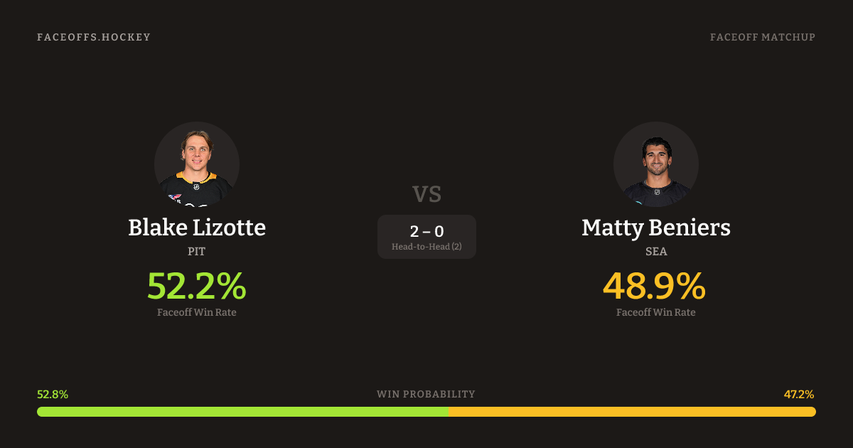 Blake Lizotte holds a +4.3% FO% edge overall. Look for Lizotte on defensive-zone draws (78% H2H, 9 meetings).