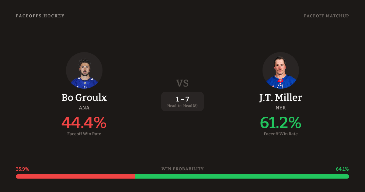 J.T. Miller holds a +12.3% FO% edge overall. Look for Miller on defensive-zone draws (67% H2H, 3 meetings). Groulx wins 41.4% vs left-shot opponents — Miller shoots left.