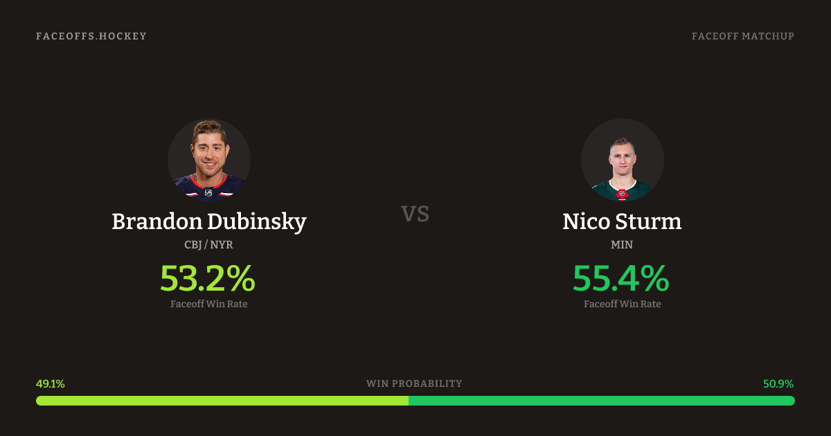 Nico Sturm holds a +3.2% FO% edge overall. Dubinsky wins 53.1% vs left-shot opponents — Sturm shoots left.