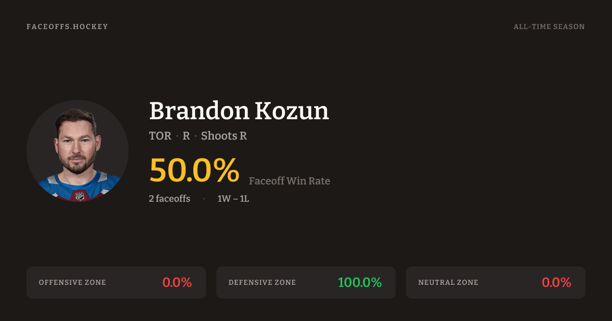 Brandon Kozun has a career faceoff win percentage of 50.0% across 2 faceoffs. Best zone: Defensive (100.0%).