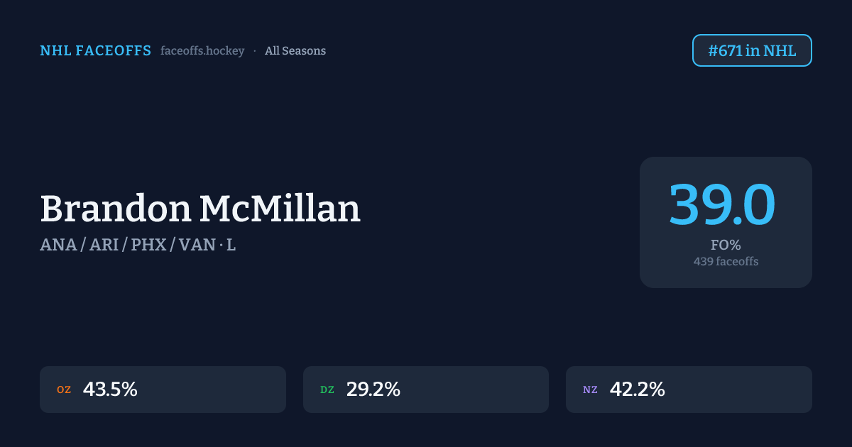 Brandon McMillan has a career faceoff win percentage of 39.0% across 439 faceoffs. Best zone: Offensive (43.5%). Ranked #671 in the league.