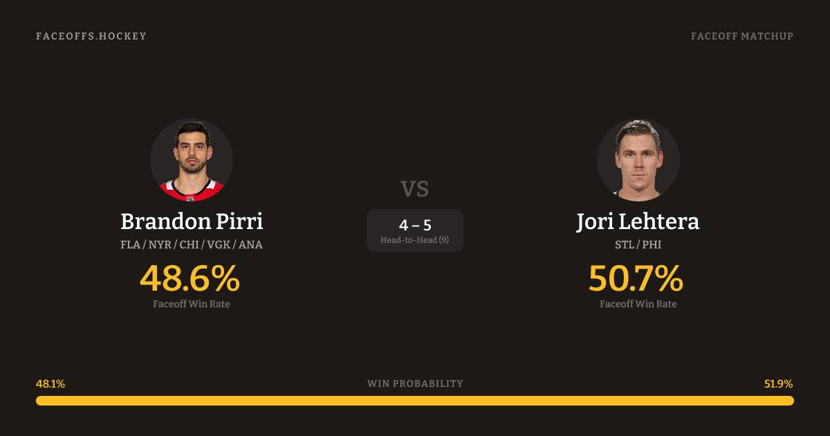 Pirri shoots left. Lehtera is 50.2% vs left-shot opponents (612).