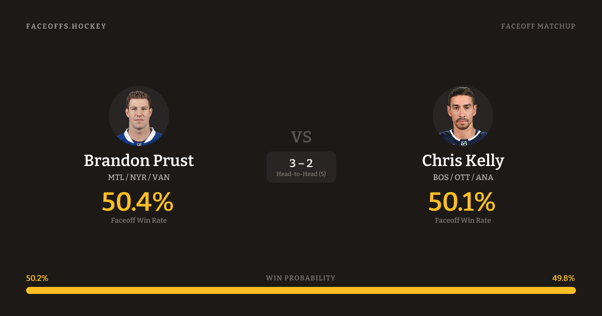 Brandon Prust holds a +3.1% FO% edge overall. Look for Kelly on defensive-zone draws (67% H2H, 3 meetings).