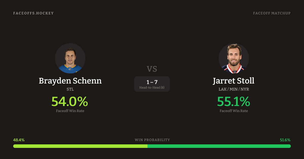 Jarret Stoll holds a +11.5% FO% edge overall. Look for Stoll on neutral-zone draws (67% H2H, 3 meetings). Schenn wins 46.2% vs right-shot opponents — Stoll shoots right.