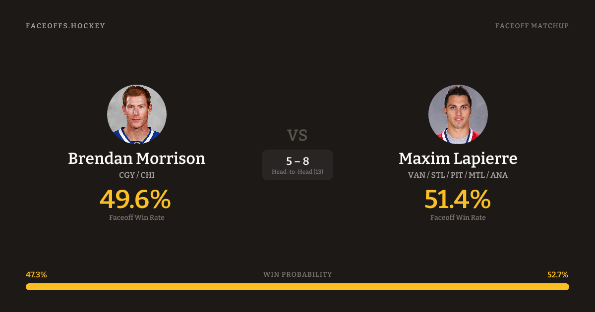 Maxim Lapierre holds a +2.6% FO% edge overall. Look for Lapierre on defensive-zone draws (80% H2H, 5 meetings). Morrison wins 37.6% vs right-shot opponents — Lapierre shoots right.