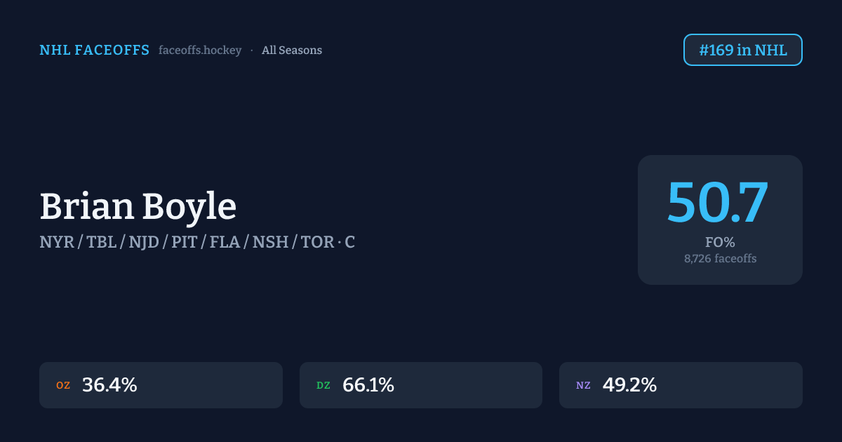 Brian Boyle has a career faceoff win percentage of 50.7% across 8,726 faceoffs. Best zone: Defensive (66.1%). Ranked #169 in the league.