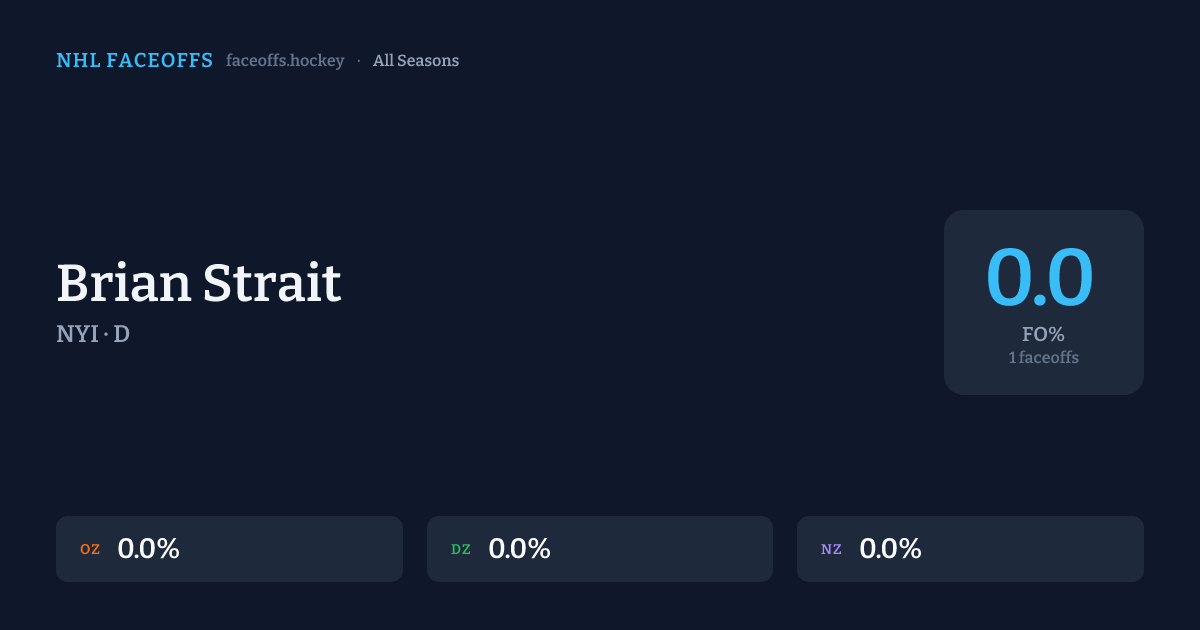 Brian Strait has a 2014-15 faceoff win percentage of 0.0% across 1 faceoffs in the 2014-15 season. Best zone: Neutral (0.0%).