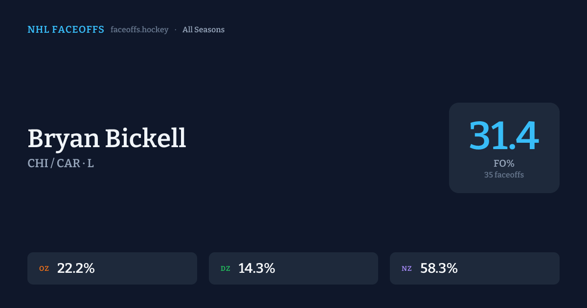 Bryan Bickell has a 2014-15 faceoff win percentage of 0.0% across 2 faceoffs in the 2014-15 season. Best zone: Neutral (0.0%).