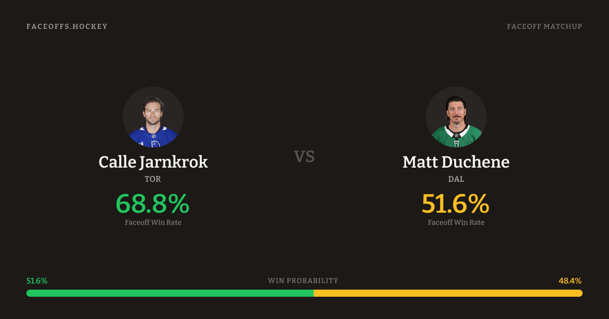 Matt Duchene holds a +10.8% FO% edge overall. Look for Duchene on neutral-zone draws (75% H2H, 8 meetings). Jarnkrok wins 39.3% vs left-shot opponents — Duchene shoots left.